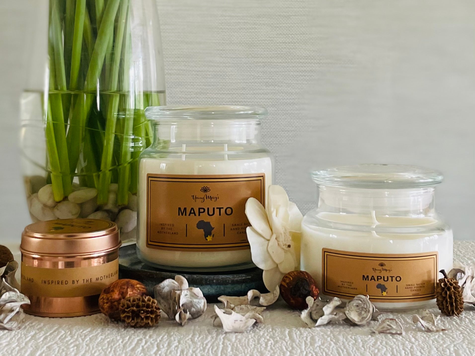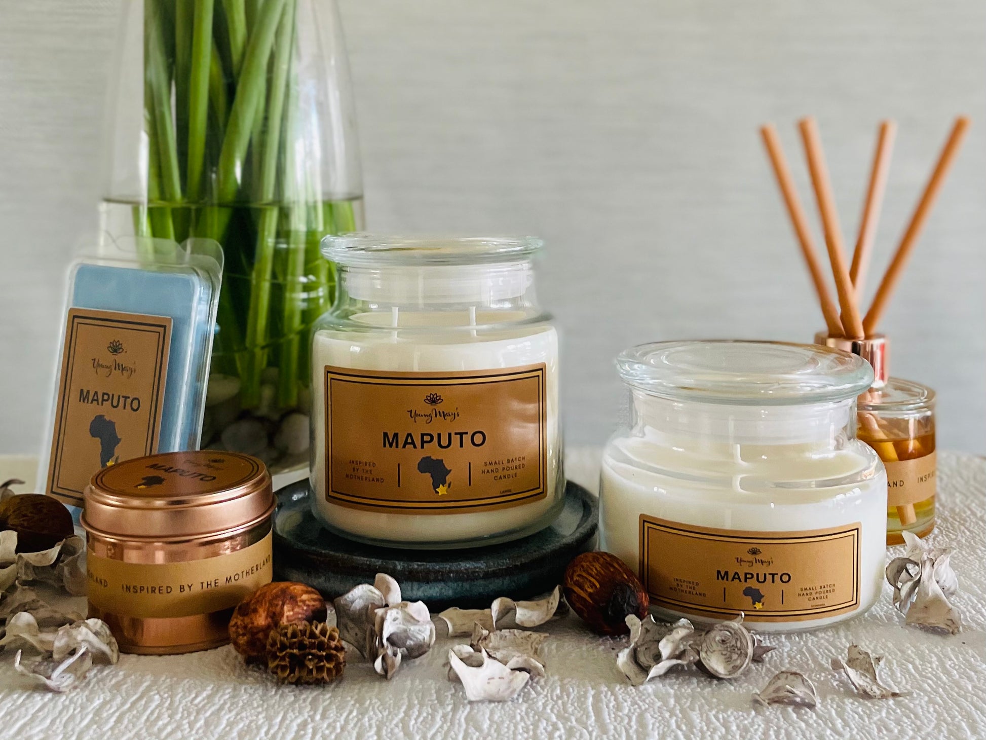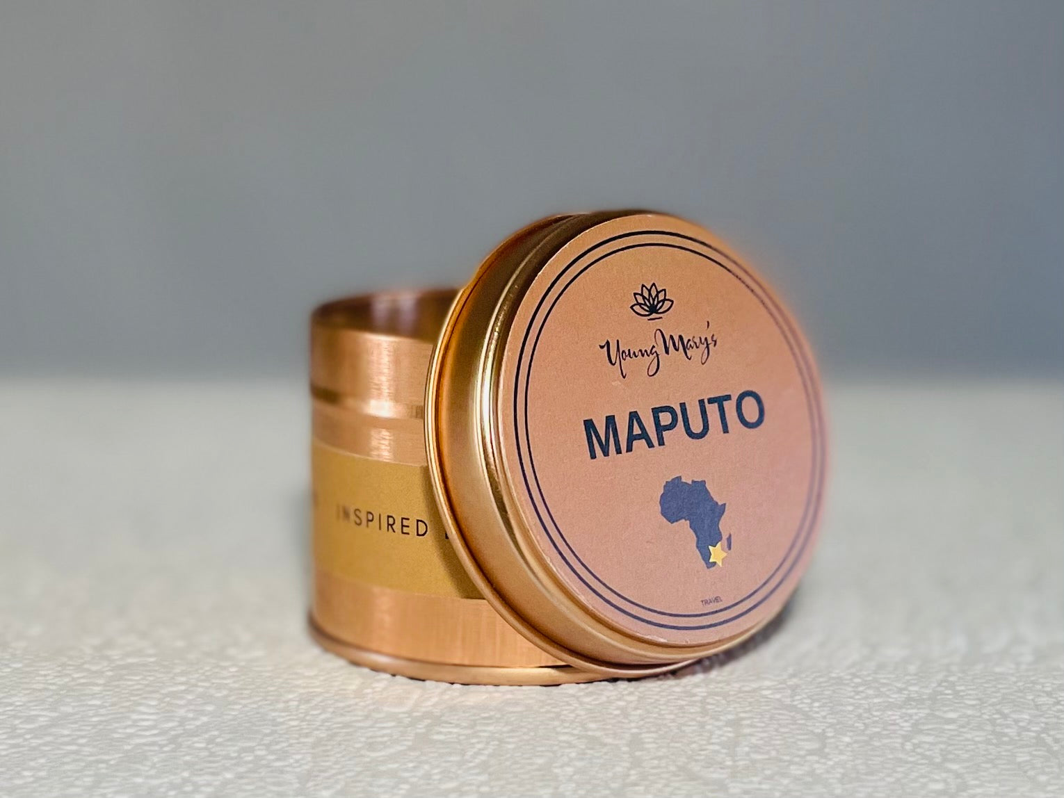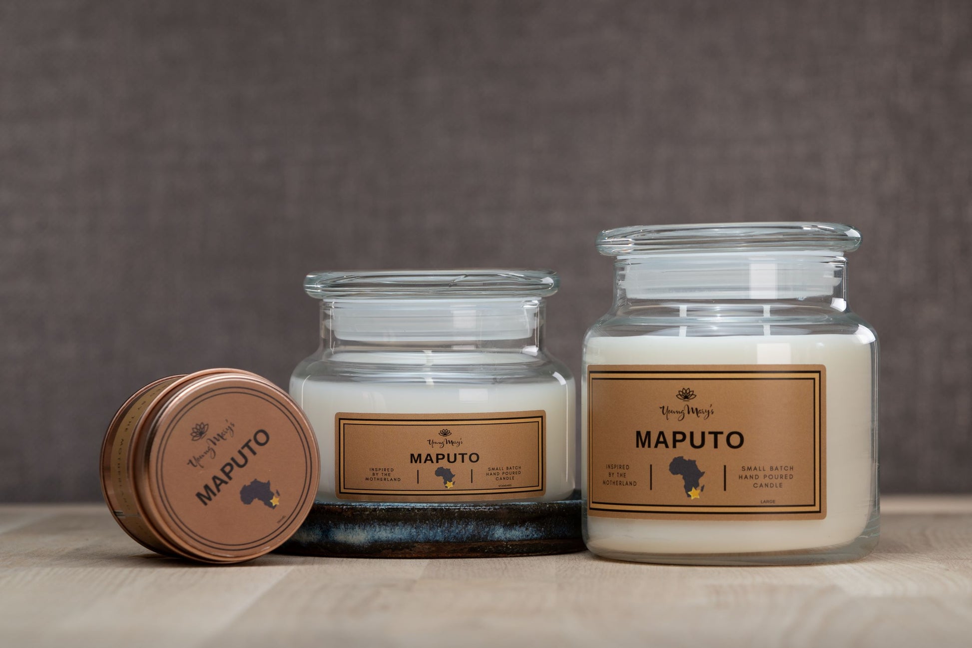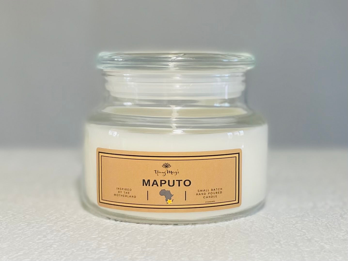 Handmade Scented Candle inspired by the beautiful city of Maputo, the capital of Mozambique. Maputo is a fun blend of tropical fruit, coconut and flower petals, making this the perfect candle to bring the beaches of Mozambique to you.